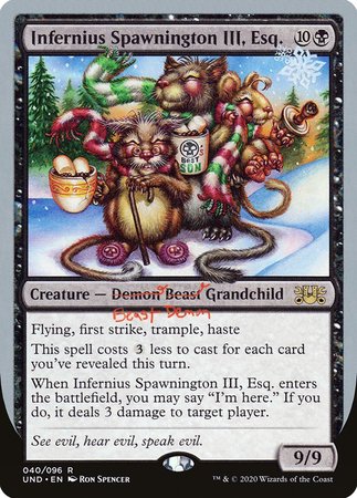 When Infernius Spawnington III, Esq. enters the battlefield, you may say "I'm here." If you do, it deals 3 damage to target player.