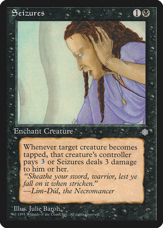 Enchant creature Whenever enchanted creature becomes tapped, Seizures deals 3 damage to that creature's controller unless that player pays {3}.