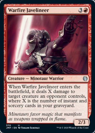 When Warfire Javelineer enters the battlefield, it deals X damage to target creature an opponent controls, where X is the number of instant and sorcery cards in your graveyard.