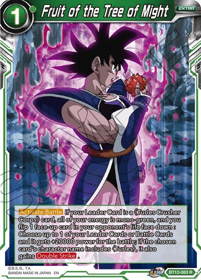 [Activate:Battle] If your Leader Card is a "Turles Crusher Corps" card, all of your energy is mono-green, and you flip 1 face-up card in your opponent's life face down : Choose up to 1 of your Leader Cards or Battle Cards and it gets +20000 power of the battle; if the chosen card's character name includes "Turles", it also gains [Double Strike].