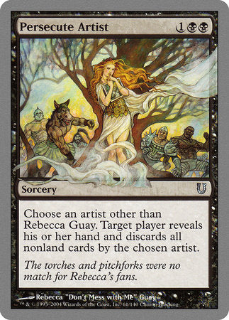 Choose an artist other than Rebecca Guay. Target player reveals their hand and discards all nonland cards with art by the chosen artist.