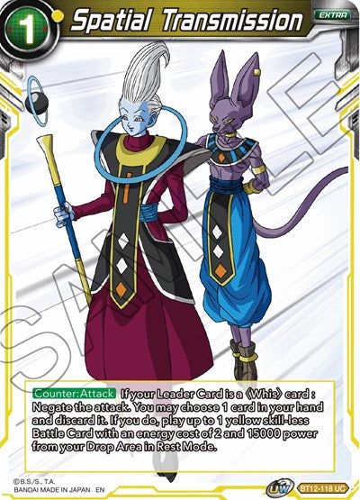 [Counter:Attack] If your Leader Card is a "Whis" card : Negate the attack. You may choose 1 card in your hand and discard it. If you do, play up to 1 yellow skill-less Battle Card with an energy cost of 2 and 15000 power fro your Drop Area in Rest Mode.