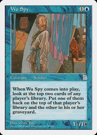 When Wu Spy enters the battlefield, look at the top two cards of target player's library. Put one of them into their graveyard.